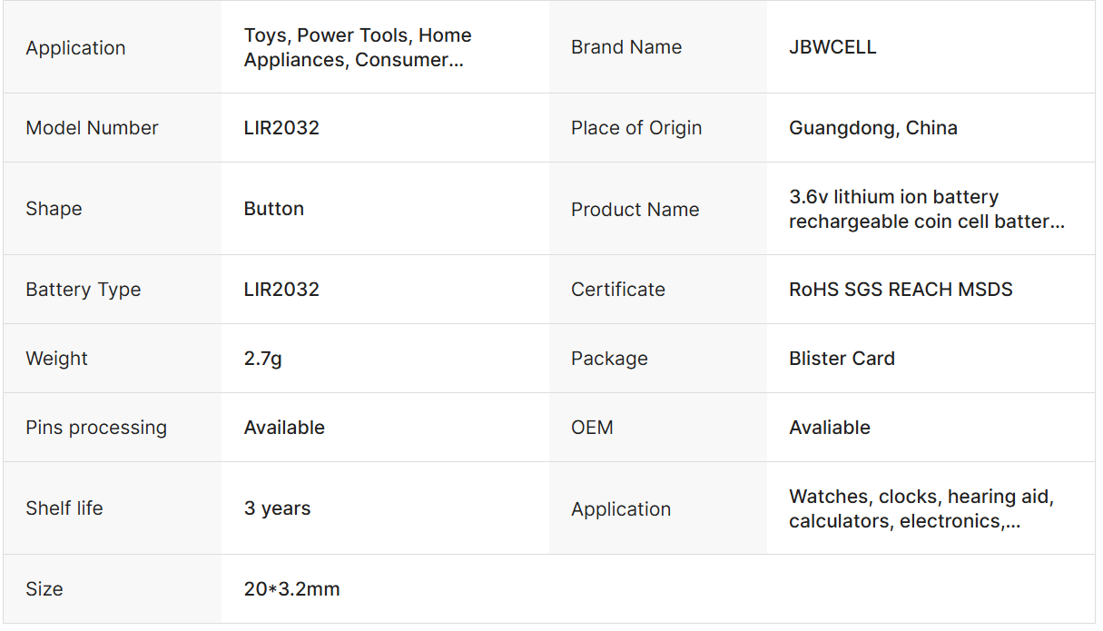 3.6v Lithium Ion Battery Rechargeable Coin Cell Battery LIR2032