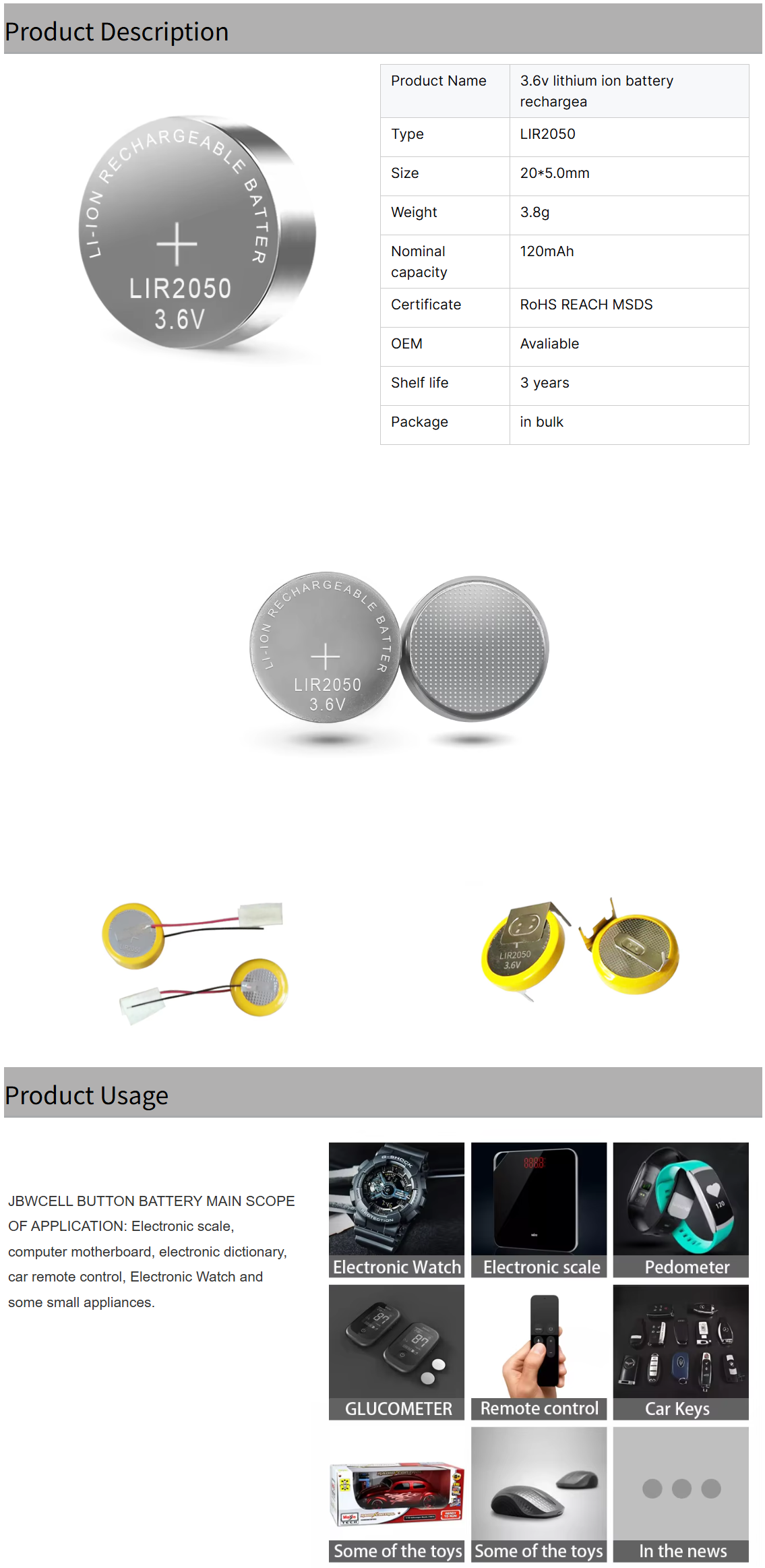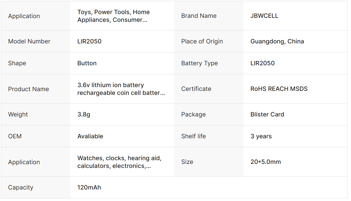 3.6v Lithium Ion Battery Rechargeable Coin Cell Battery LIR2050