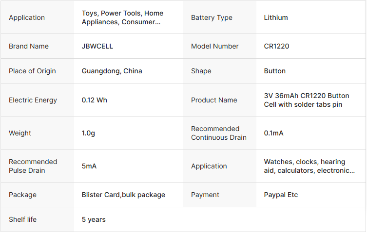 3V 36mAh CR1220 Lithium Manganese Dioxide Button Cell with Solder Tabs Pin
