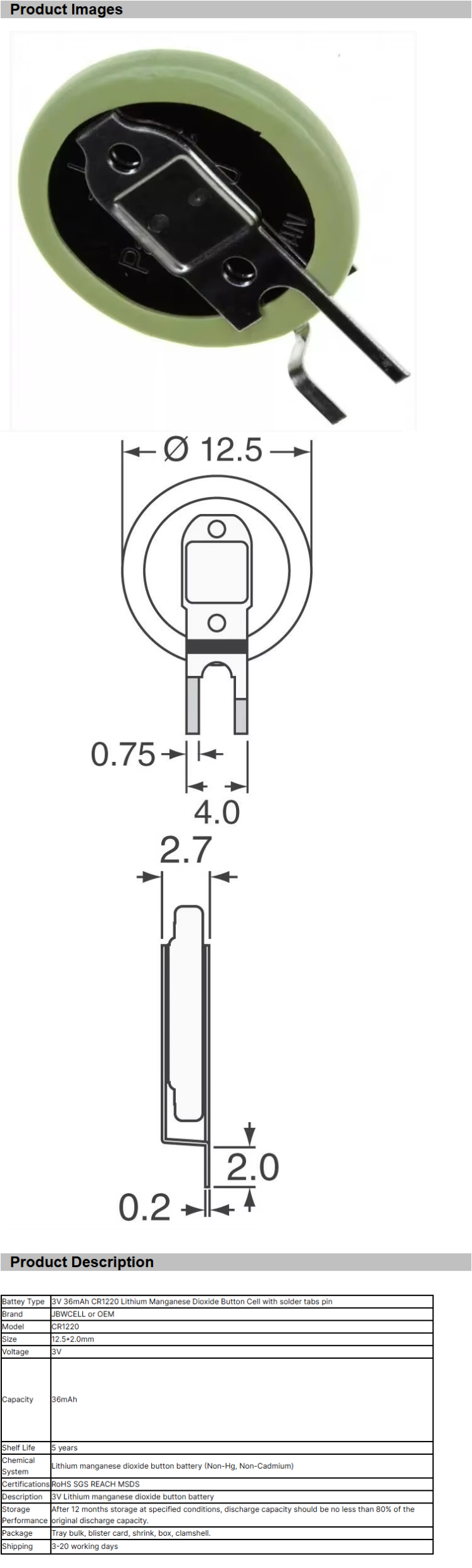 / 3V 36mAh CR1220 Lithium Manganese Dioxide Button Cell with Solder Tabs Pin