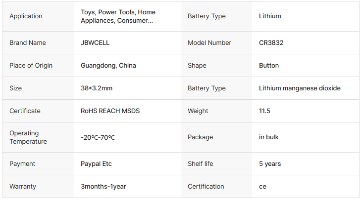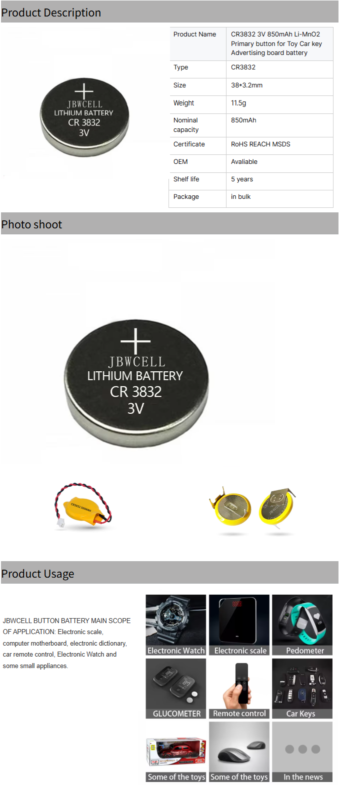 3V 850mAh CR3832 Lithium Battery Li-MnO2 Primary Button for Toy Car Key for Home Appliances Power Tools Excellent for