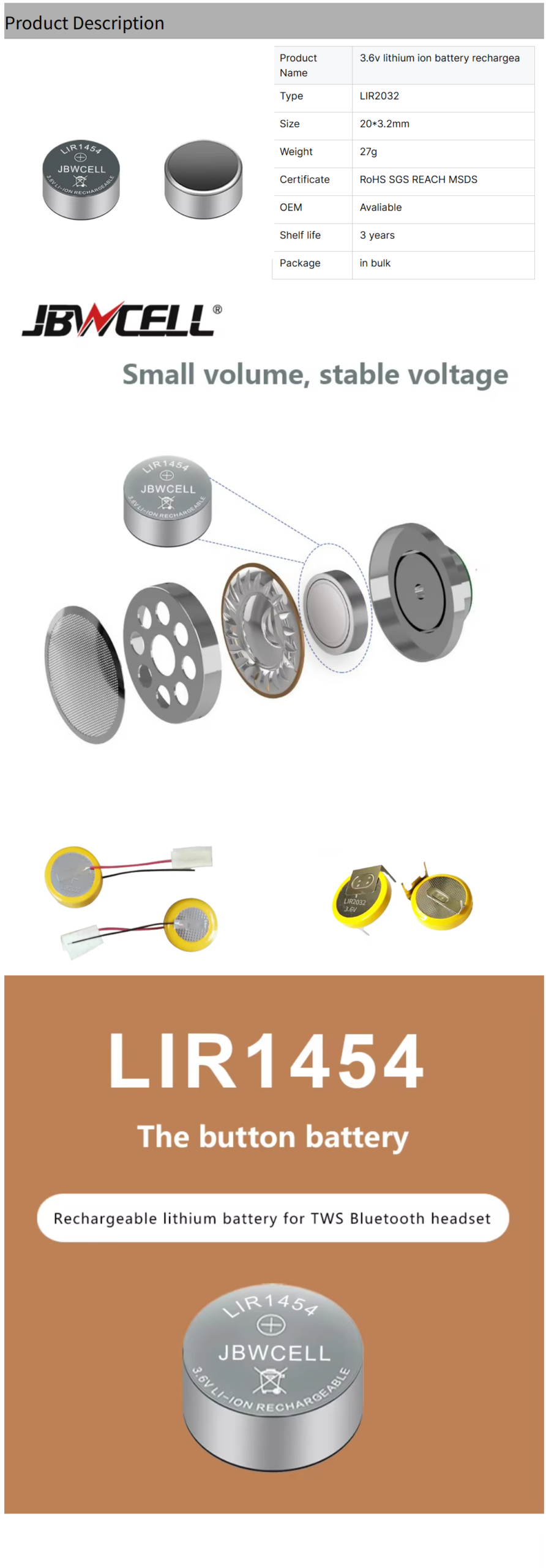 / CP1454 ICR1454 LIR1454 Small Button Lithium Ion Battery 3.6V TWS Earphone LIR940 LIR1040 LIR1054 LIR1240 LIR1254