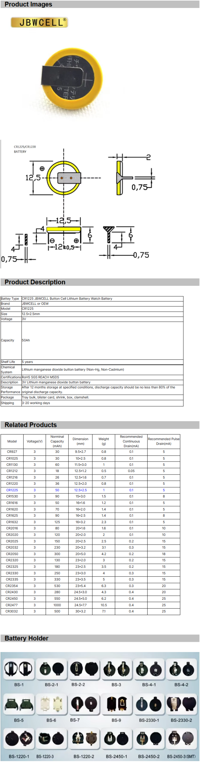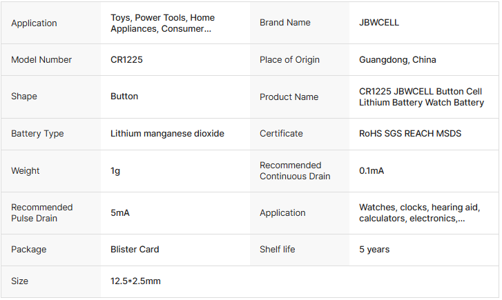 / CR1225-1HF Lithium Button Battery with Solder Tabs