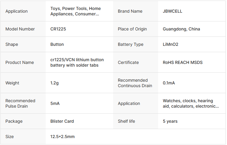 CR1225/VCN Lithium Button Battery with Solder Tabs CR1225 Battery