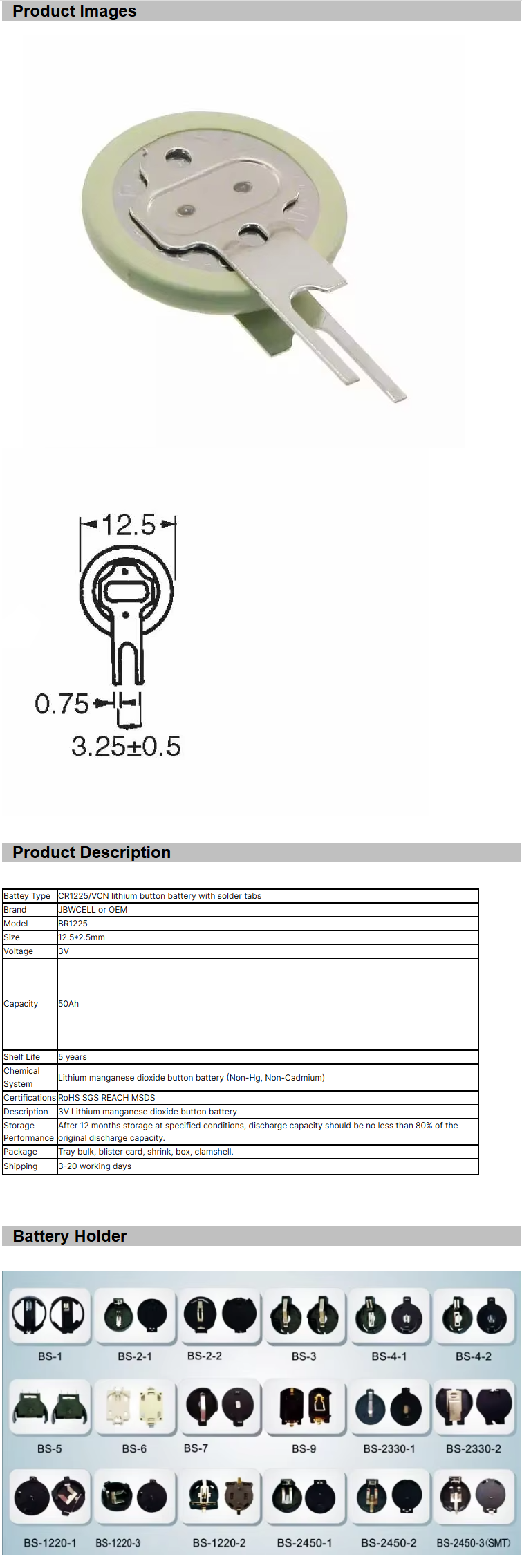 / CR1225/VCN Lithium Button Battery with Solder Tabs CR1225 Battery