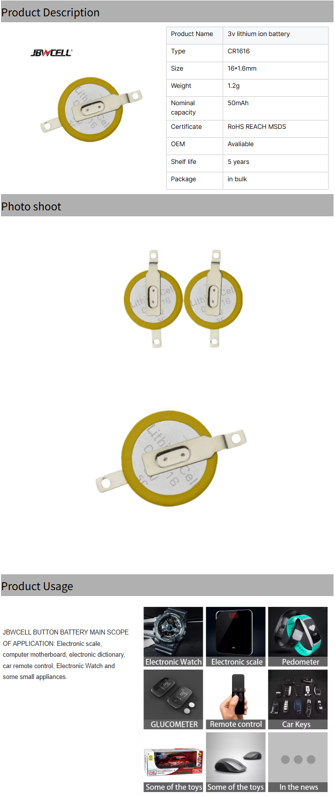 CR1616 with Solder Tabs for Pcb the Thinnest Button Cell Battery Cr1616