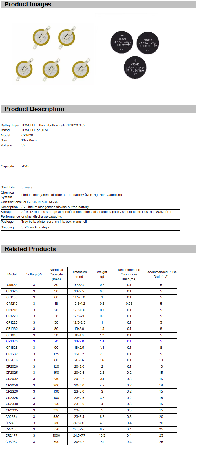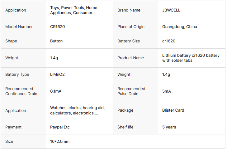 CR1620 3V Lithium Battery Cr1620 with Solder Tabs