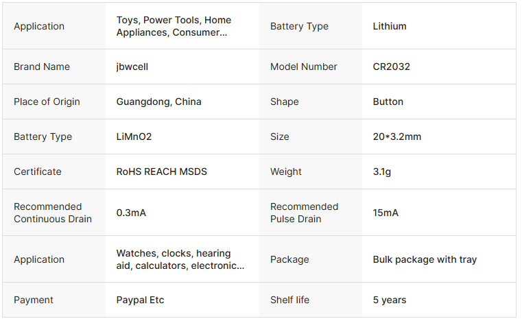 CR2032 Battery 3V Lithium Button Cell Battery