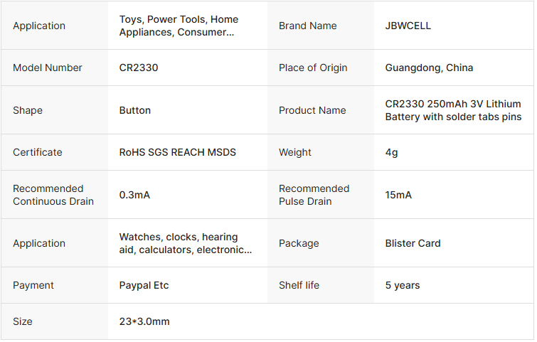 CR2330 250mAh 3V Lithium Battery 23*3.0mm Non-rechargeable Battery with Solder Tabs Pins