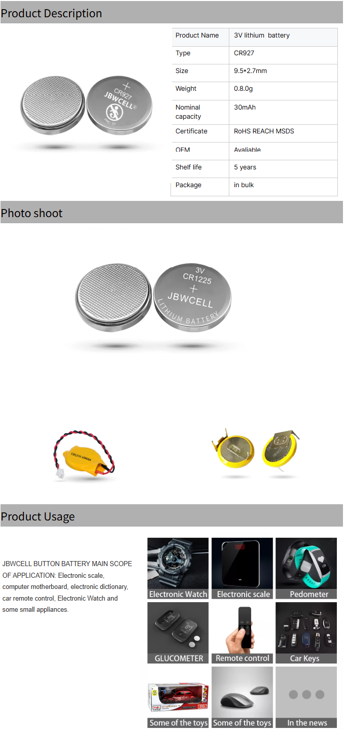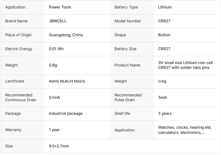 Customizable CR927 3V Lithium Coin Cell with Solder Tabs Pins for Power Tools Factory Direct