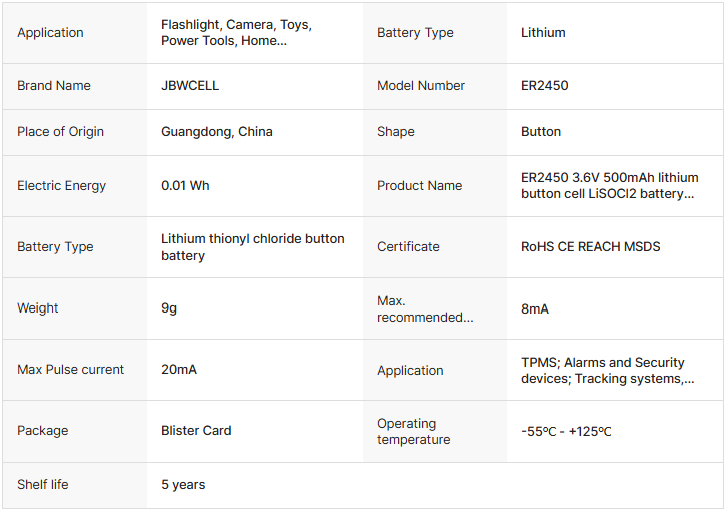ER2450 3.6V 500mAh Lithium Button Cell LiSOCl2 Battery with Pins for Home Appliances Toys Remote Control Flashlight Power Tools