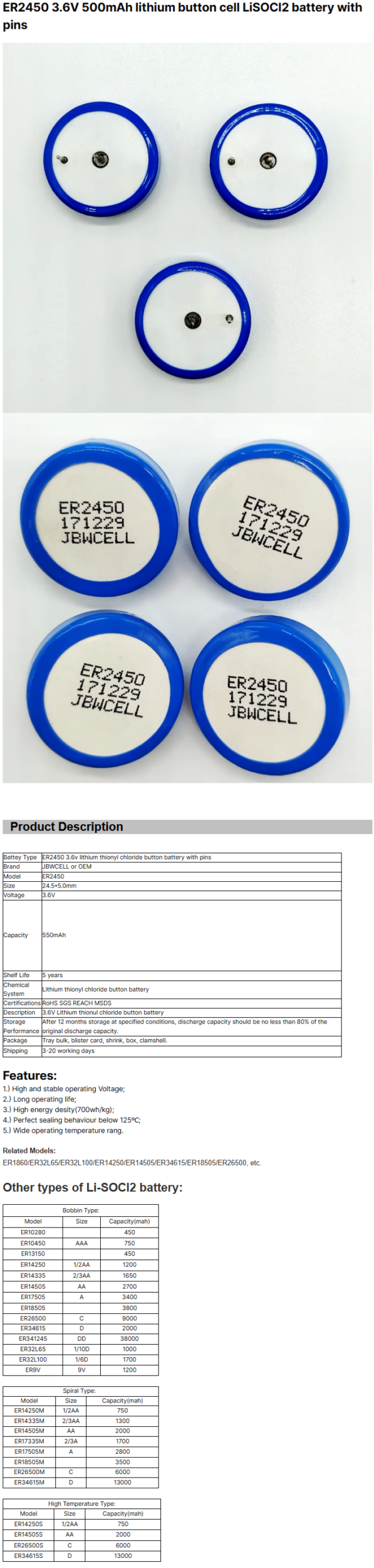 / ER2450 3.6V 500mAh Lithium Button Cell LiSOCl2 Battery with Pins for Home Appliances Toys Remote Control Flashlight Power Tools