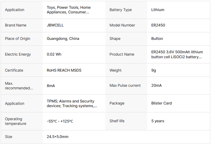 ER2450 3.6V 500mAh Lithium Button Cell LiSOCl2 Battery with Pins High Temperature for Home Appliances Toys Consumer Electronics