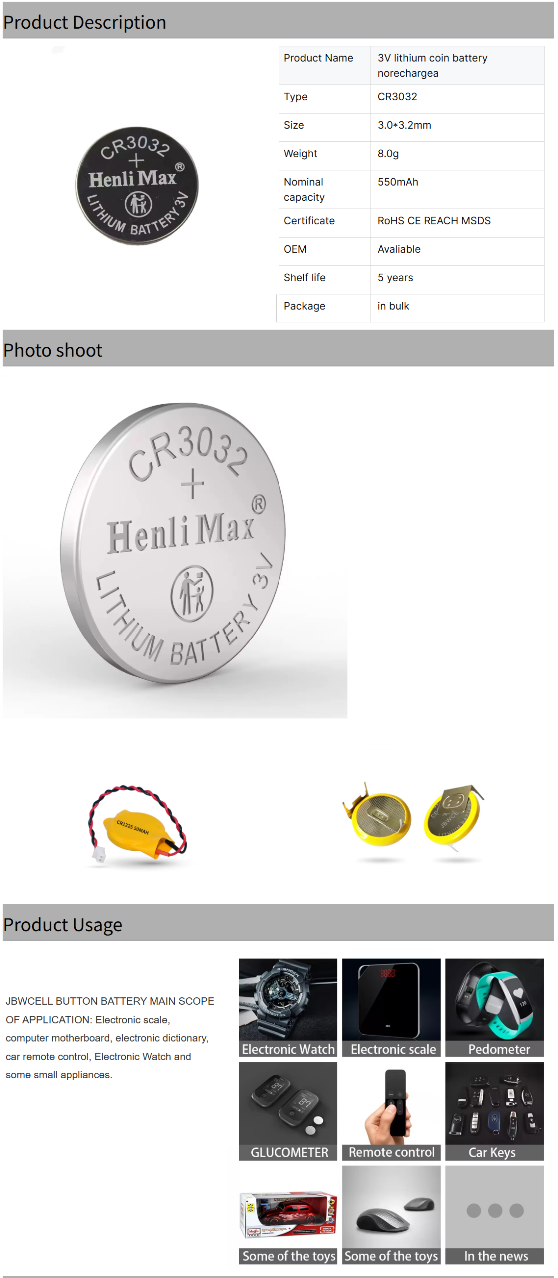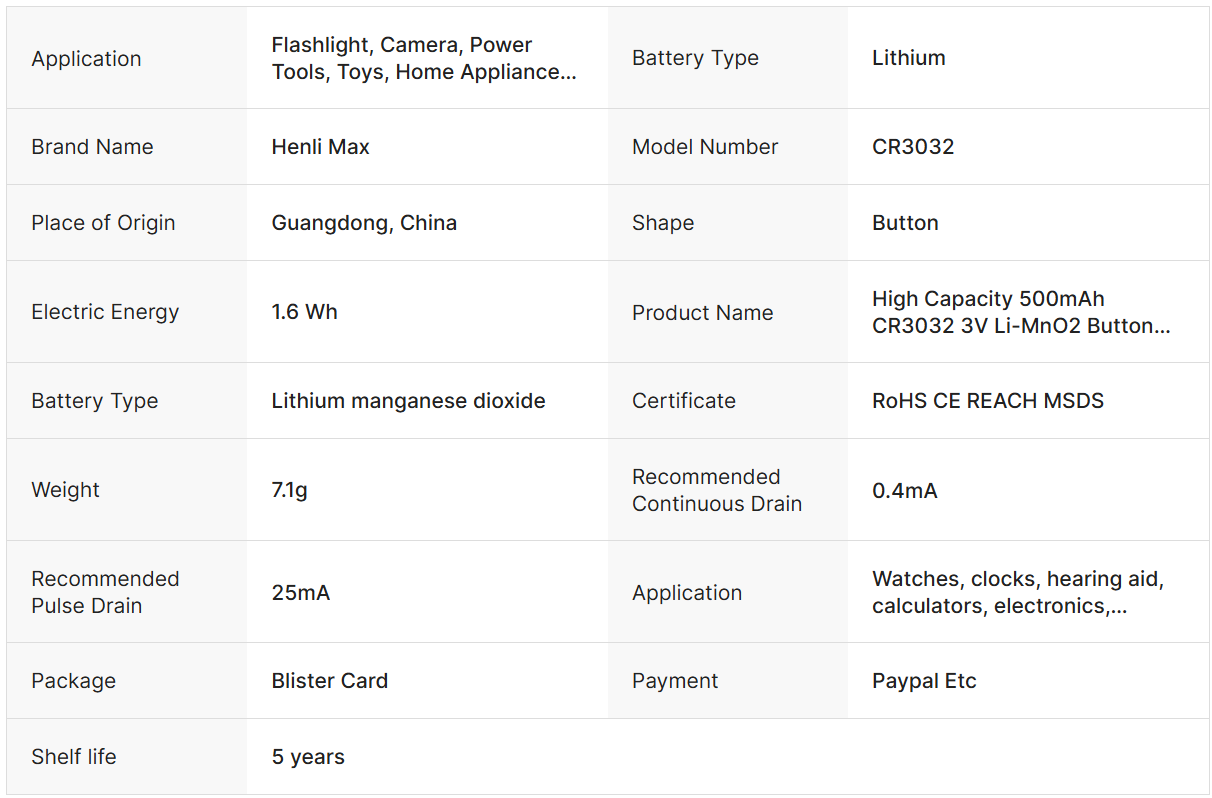 Henli Max CR3032 3V Lithium Li-MnO2 Button Cell Battery 550mah for Home Appliances Toys Remote Control and Flashlight