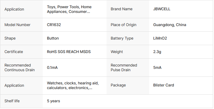 High Capacity 3V Lithium Coin Cell Cr1632 Battery