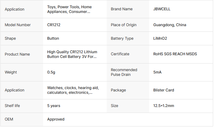 High Quality CR1212 Lithium Button Cell Battery 3V for Watch