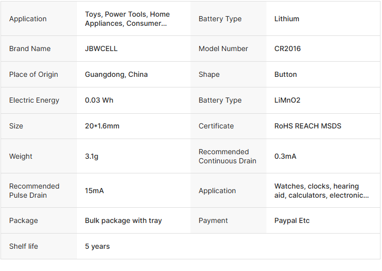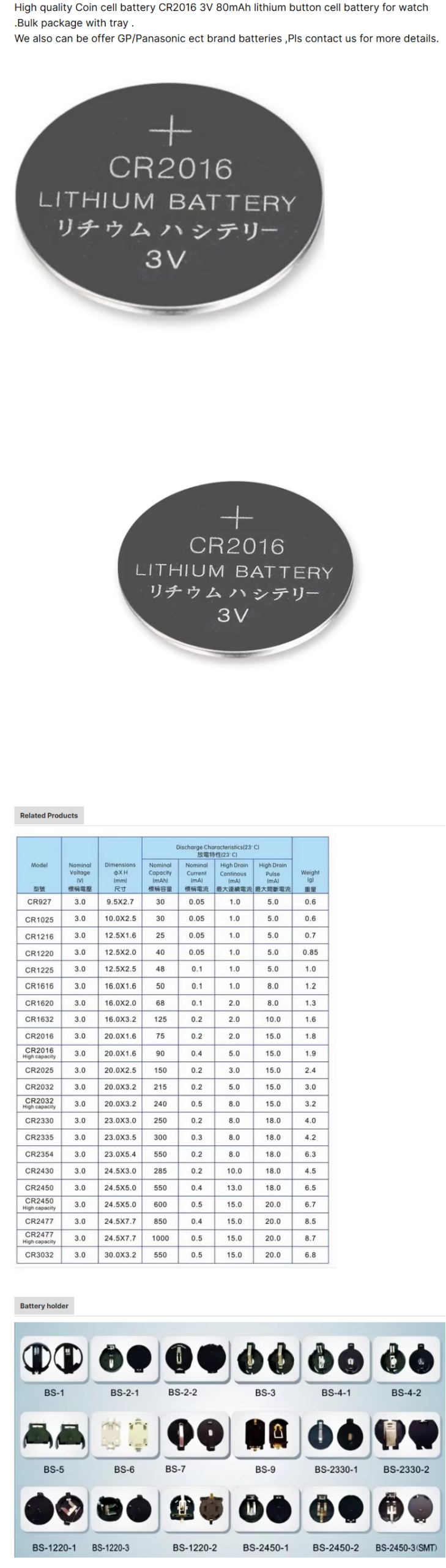 High Quality CR2016 3V 80mAh Lithium Limno2 Button Cell Primary Batteries for Home Appliances Consumer Electronics Power Tools