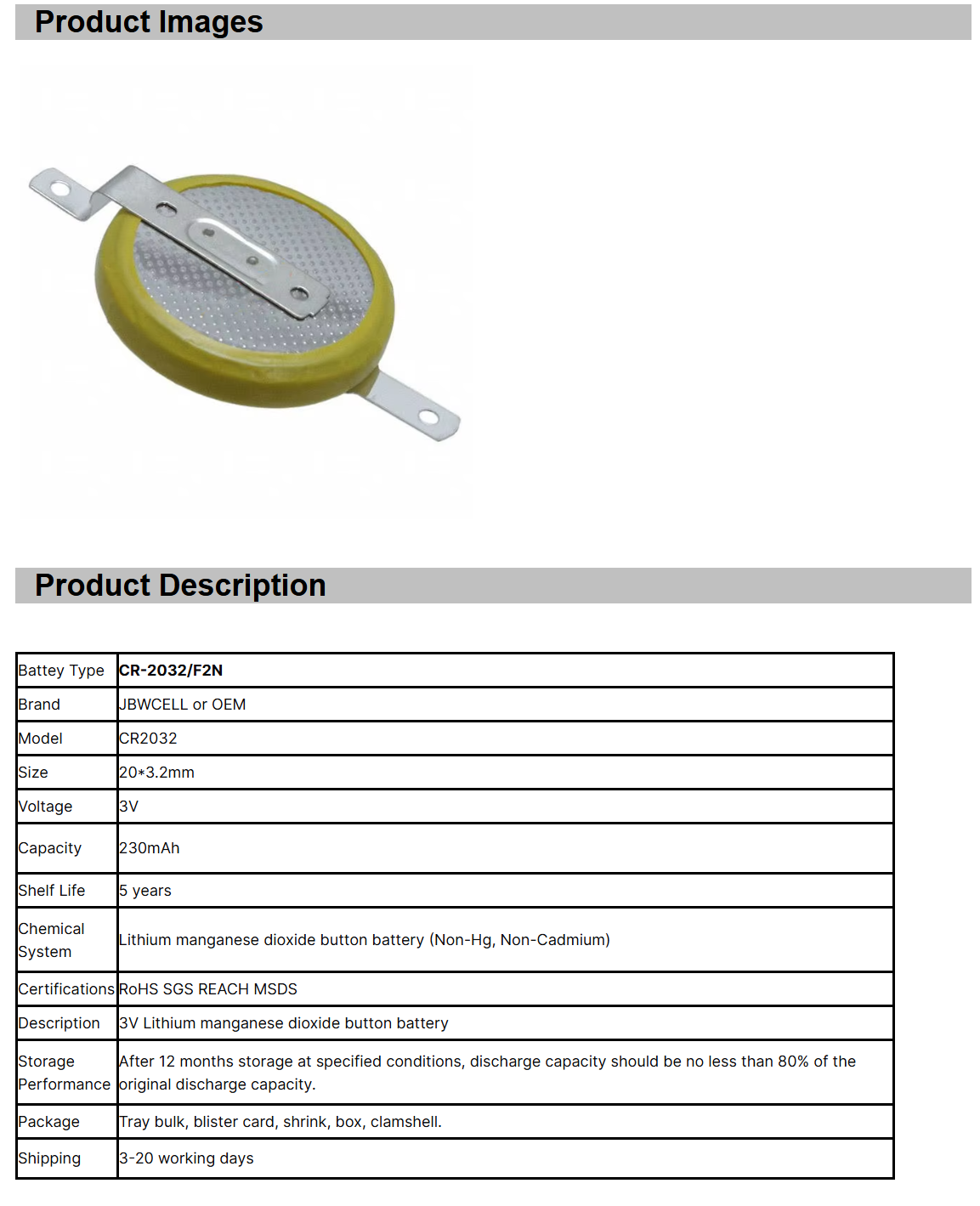 / JBWCELL CR-2032/F2N Lithium Battery with Solder Tabs Pins for Toys Home Appliances Consumer Electronics Power Tools