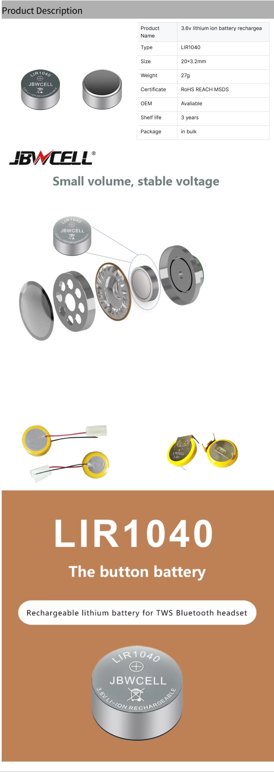 / LIR1040 Lithium Rechargeable Battery for Headset