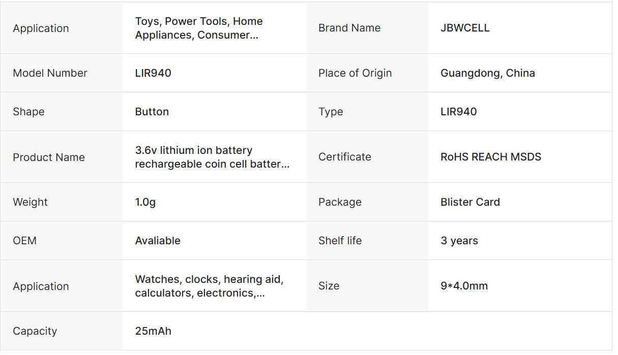3.6v Lithium Ion Battery Rechargeable Coin Cell Battery LIR1025