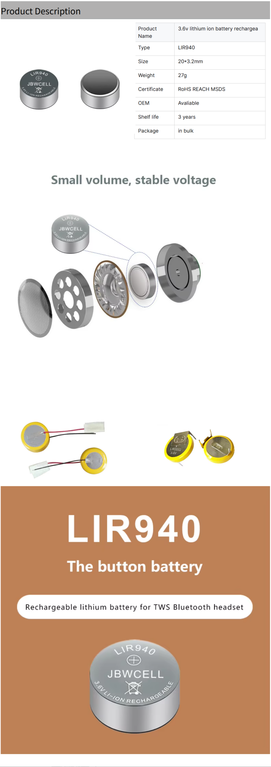 / LIR940 Lithium Rechargeable Battery for Headset