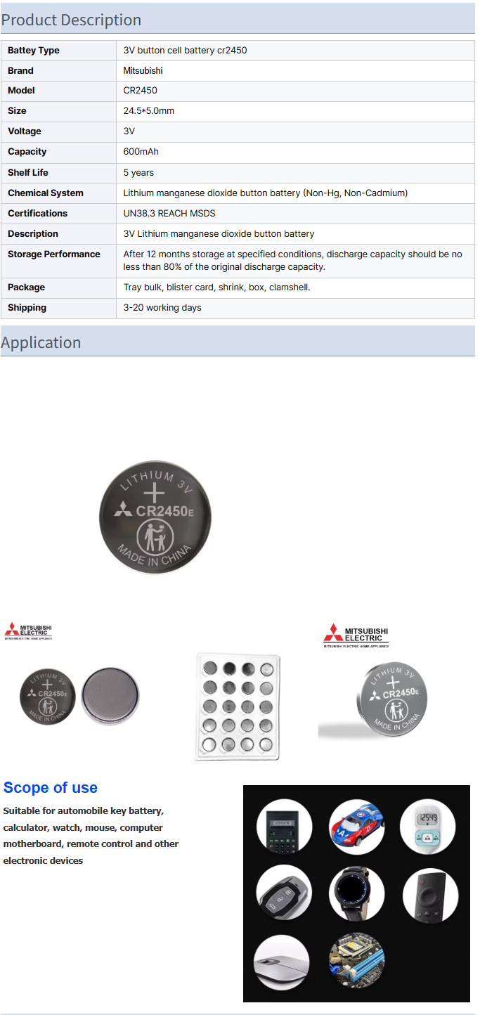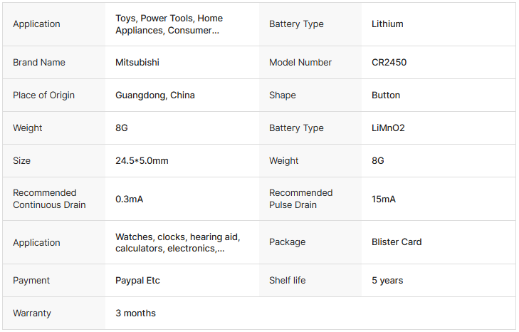 Mitsubishi CR2450 3V Lithium Coin Battery Limno2 Button Cell Battery for Toys Home Appliances Consumer Electronics
