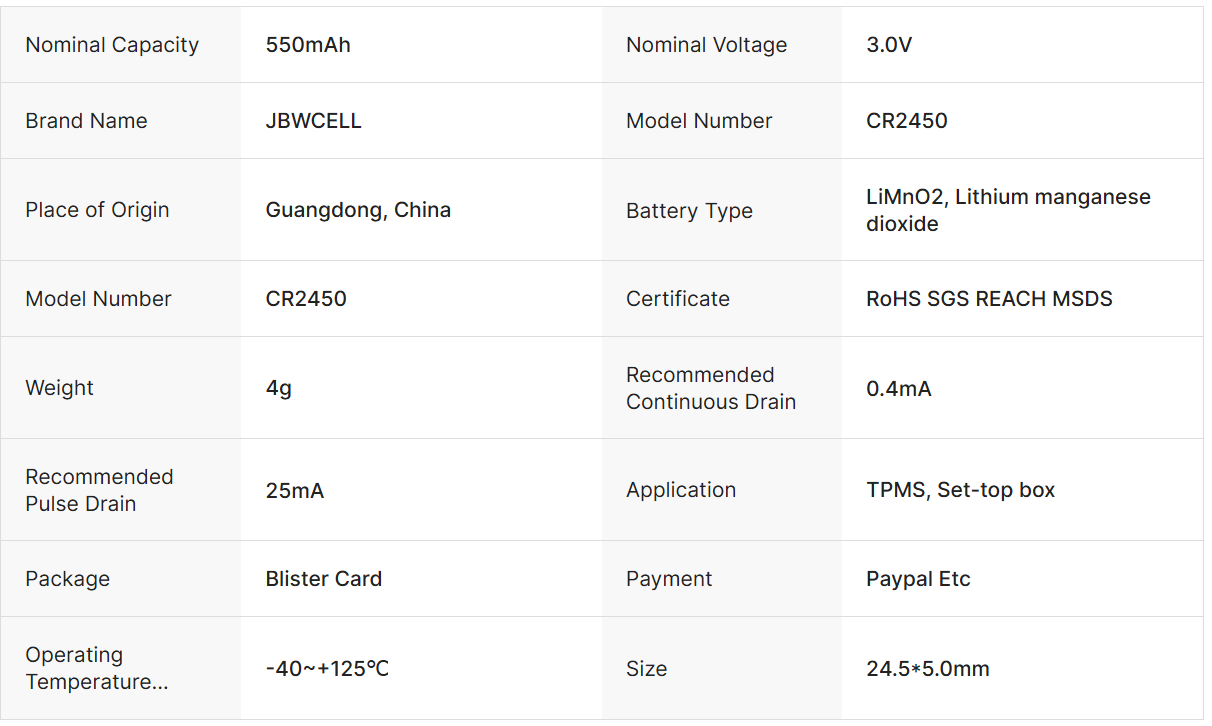 Original Cr2450 Lithium Coin Cell Battery High Temperature Battery